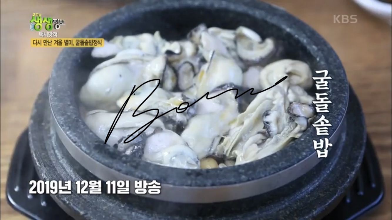 2020년 12월 17일 목요일에 방송된 KBS 2TV 저녁생생정보 1209회, <택시맛객> 코너에서는 겨울철 별미, 굴돌솥밥정식 맛집이 소개됐습니다.