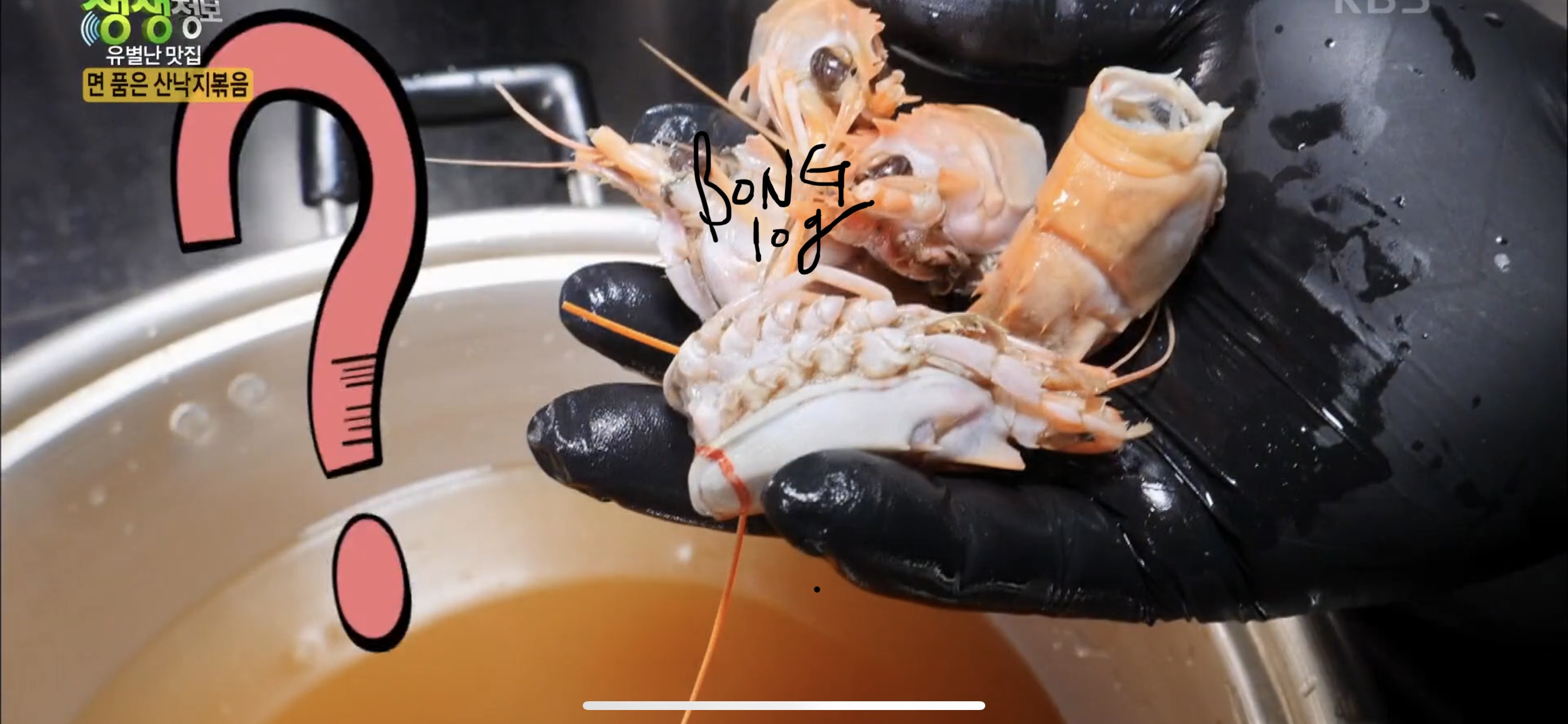 완성된 밑국물에 낙지와 함께 가시발새우 머리를 넣고 데쳐주는데요. 가시발새우는 일반 새우에 비해 머리가 커서 감칠맛을 더욱 올려준다고 합니다.